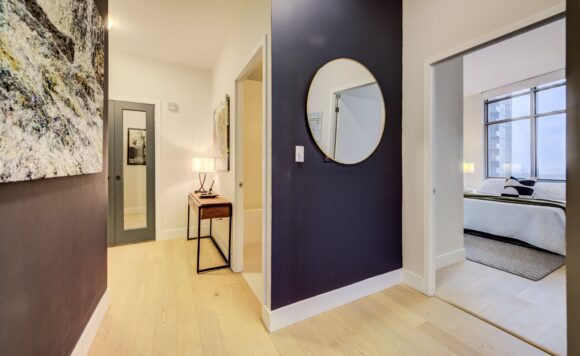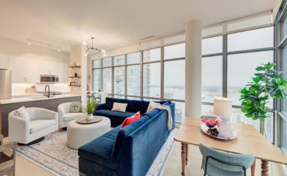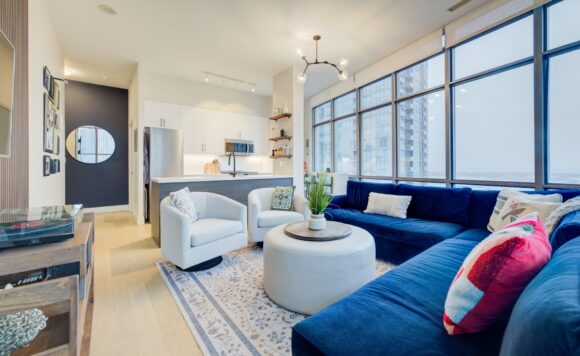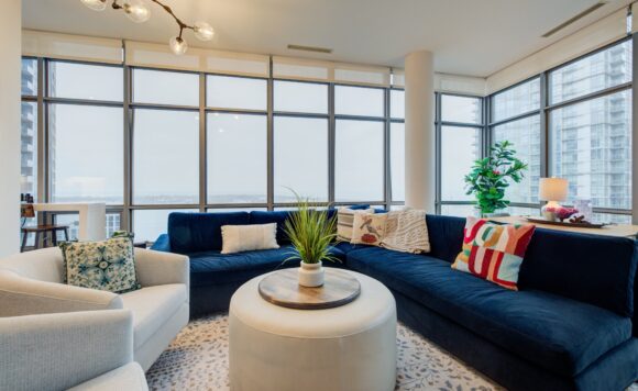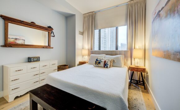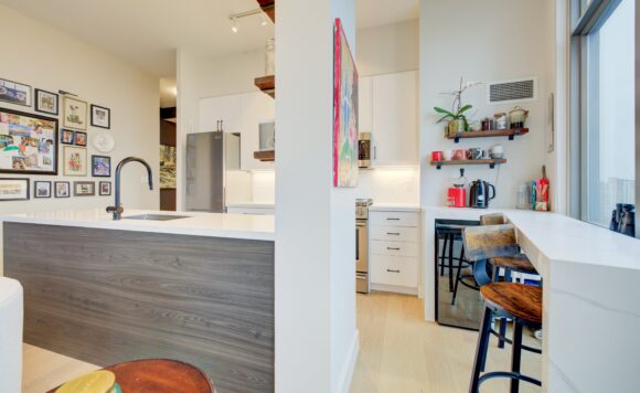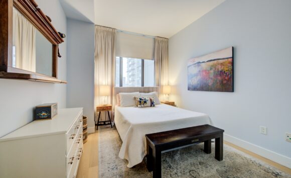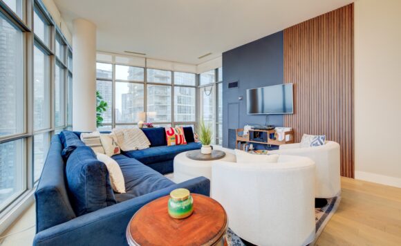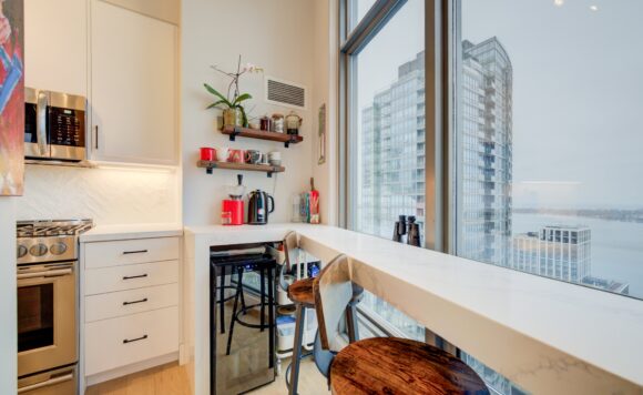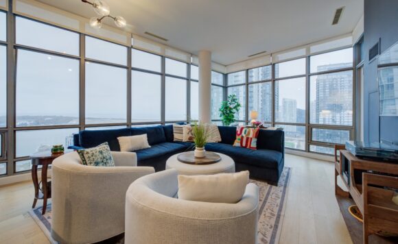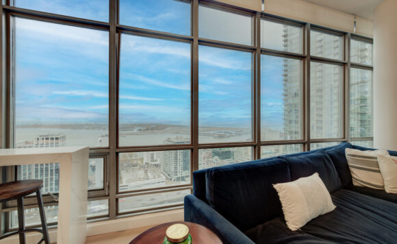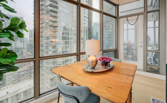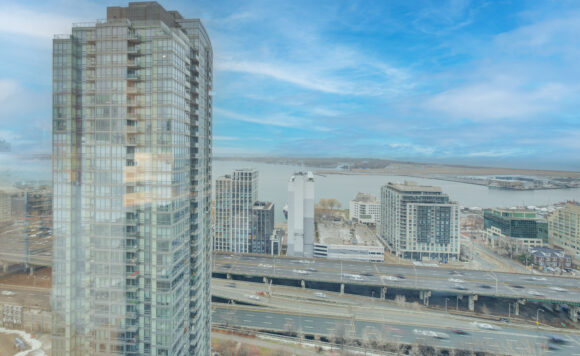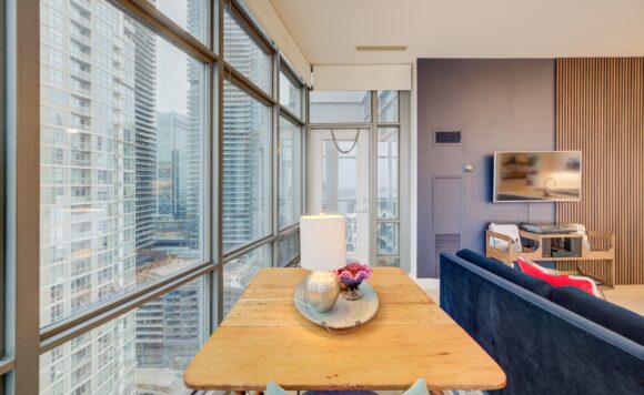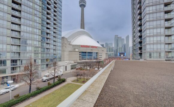 Live at the Lake in a rare Penthouse Corner Suite. Experience elevated living in this stunning penthouse suite featuring 10-ft floor-to-ceiling panoramic windows with breathtaking south views of Lake Ontario & the Island Airport. Located in sought-after Harbour View Estates, residents enjoy exclusive access to the renowned “Super Club”-a separate facility with indoor access offering an indoor pool, gym, BB courts, squash, tennis, & more. This fully renovated home offers approximately 1,100 sq. ft. of thoughtfully designed space, including a bonus room ideal for a home office, complete with 10-ft ceilings & glass French doors. The open-concept kitchen features quartz countertops, stainless steel appliances, a 5-burner gas stove, built-in microwave, breakfast bar with lake views, island stainless steel sink, & a dedicated coffee/beverage bar. The suite showcases high-end 5″ engineered hardwood flooring T/O the living areas, custom window coverings, & a neutral designer colour palette. Both bathrooms have been beautifully renovated with oversized tiles, glass enclosures, & quartz finishes. The primary ensuite feat a rain shower with an oversized glass shower, while the main bath offers a full-sized tub. Two generously sized bedrooms incl double closets, the unit is equipped with full-size ensuite laundry. Penthouse living is complemented by two side-by-side parking spaces, conveniently located just steps from the building entrance. Ideally situated at 3 Navy Wharf, this location is steps to the Rogers Centre, minutes to Scotiabank Arena, the CN Tower, & the Well entertainment district. Quick access to the Gardiner via Spadina, & seamless transit options including GO Train, UP Express, & subway are all nearby. The building offers 24-hour concierge service, an excellent elevator-to-unit ratio with only 30 floors & 3 elevators. If you’re seeking a rarely offered penthouse corner suite with balcony, spectacular lake views, an unbeatable downtown lifestyle, this is it!